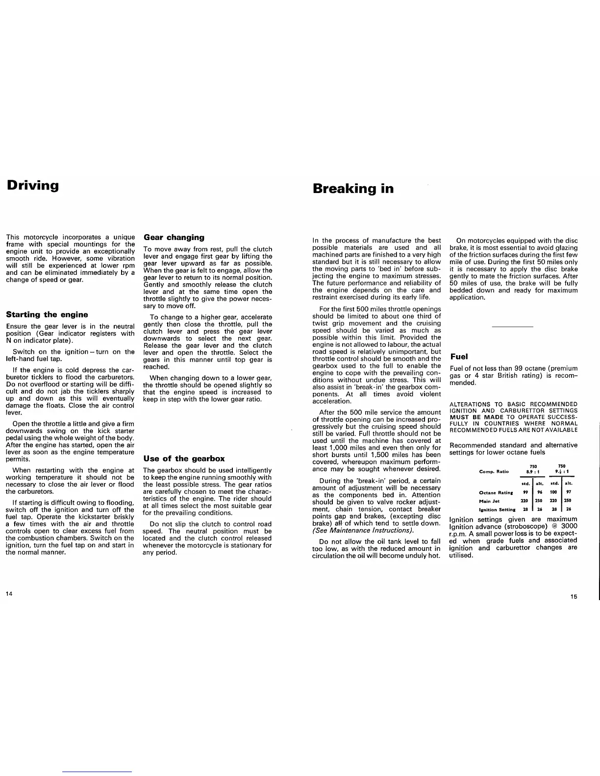 Norton Commando 750 - Motorcycle Operation Guide; Starting and Driving Procedures; Engine Break-in Process; Fuel Recommendations