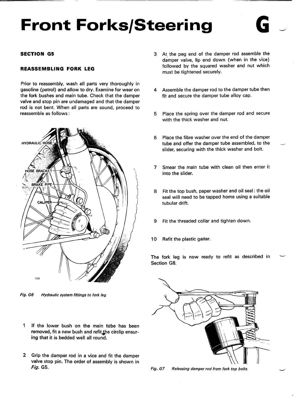 Norton Commando 850 - Reassembling Fork Leg; Hydraulic System Fitting to Fork Leg; Releasing Damper Rod from Fork Top Bolts