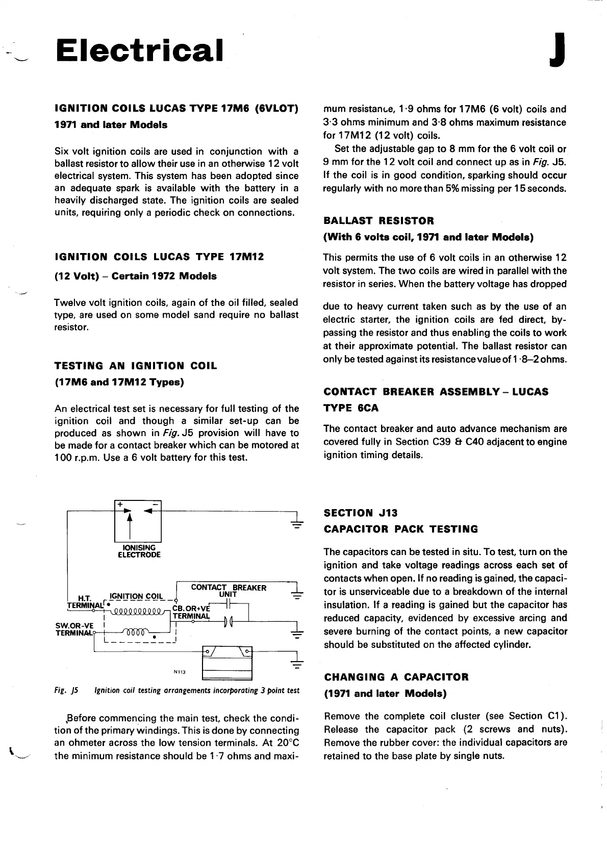 Norton Commando 850 - Ignition Coils Lucas Type 17 M6 1971 and Later Models;Type 17 M12 Certain 1972 Models; Testing an Ignition Coil (17 M6 and 17 M12 Types); Connect Breaker Assembly - Lucas Type 6 CA; Ballast Resistors, Capacitor Pack Testing