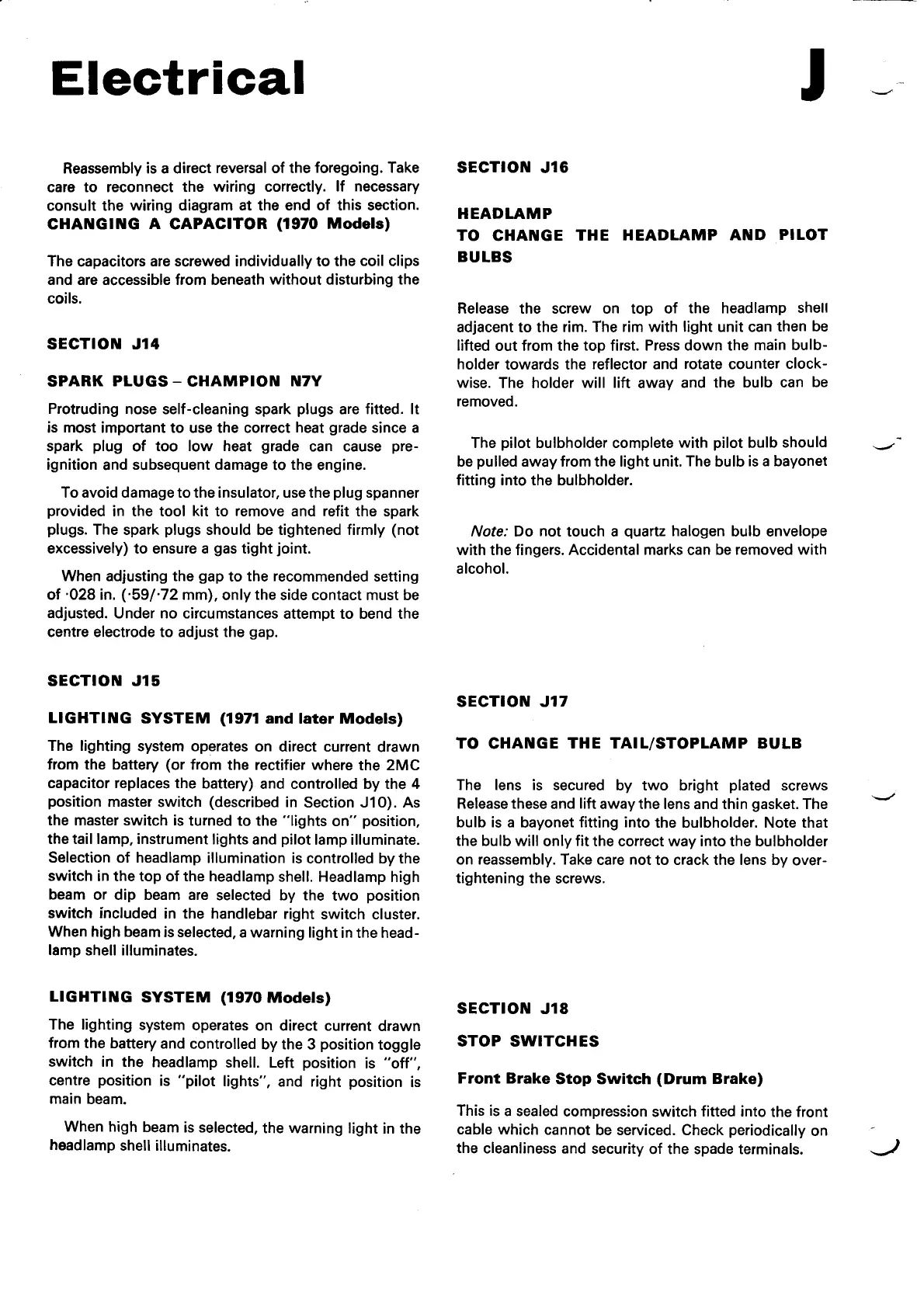 Norton Commando 850 - Changing a Capacitor; Spark Plugs - Champion N7 Y; Lighting System, Stop Switches; To Change the Headlamp and Pilot Bulbs, to Change the Tail;Stomplamp Bulb