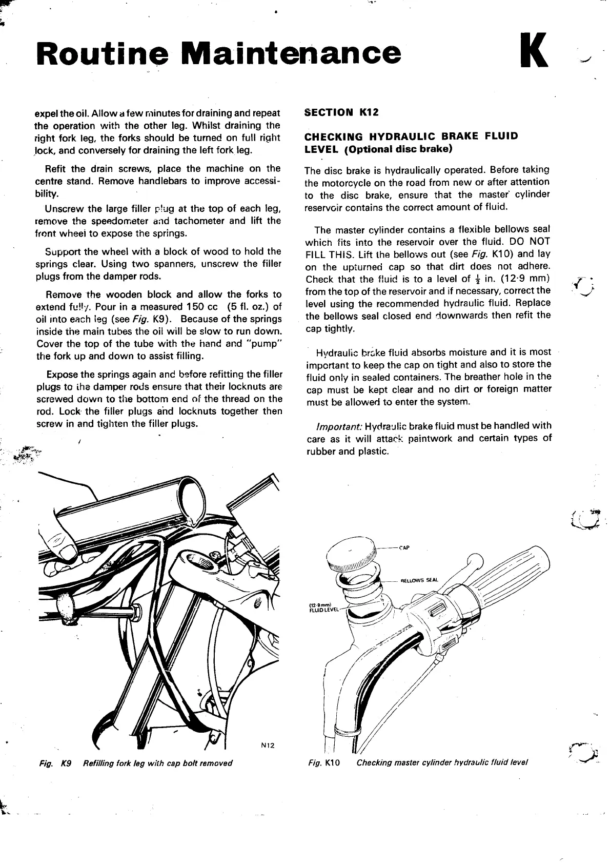 Norton Commando 850 - Checking Hydraulic Brake Fluid Level; Refilling Fork Leg with Cap Bolt Removed; Checking Master Cylinder Hydraulic Fluid Level