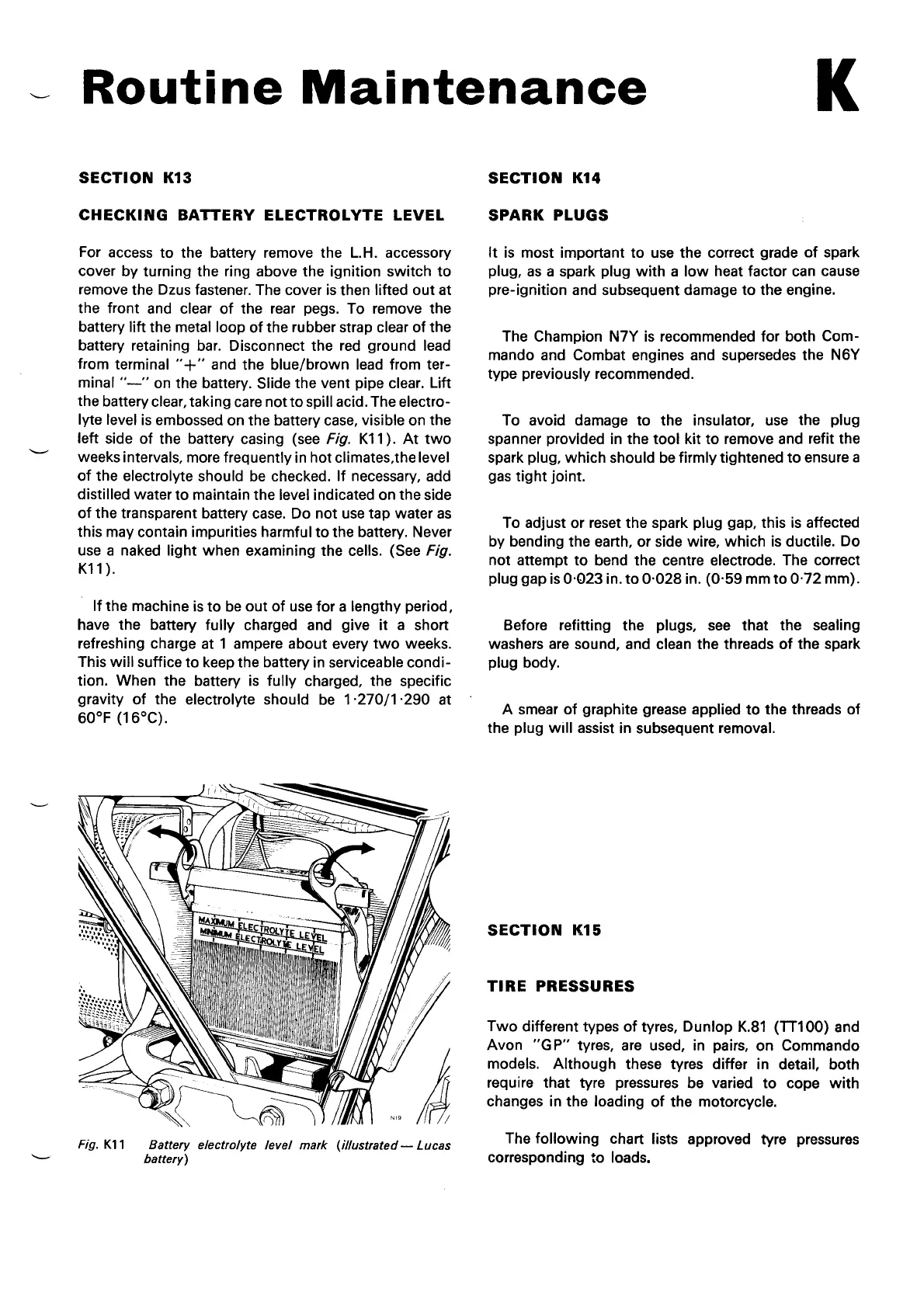 Norton Commando 850 - Checking Battery Electrolyte Level; Spark Plugs; Tire Pressures; Battery Electrolyte Level Mark