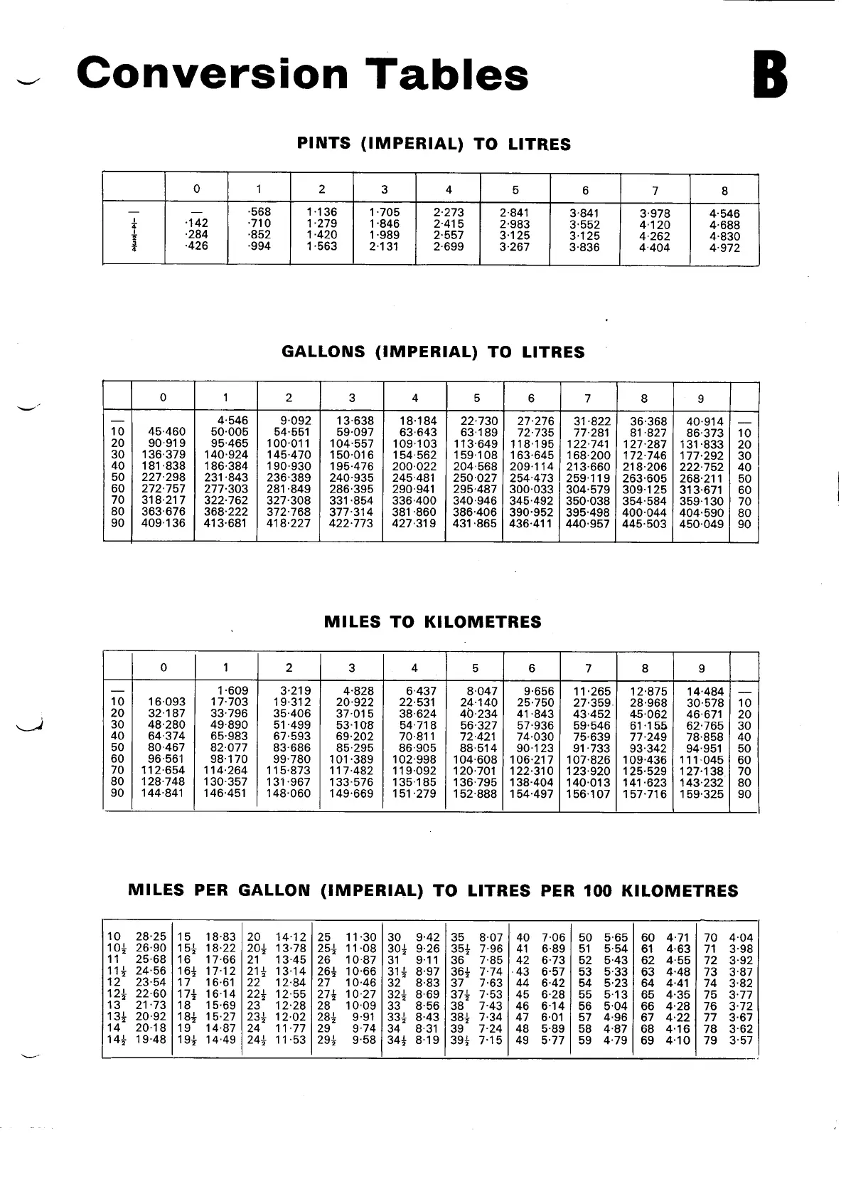 Norton Commando 850 - Pints to Liters Conversion Table; Gallons to Liters Conversion Table; Miles to Kilometers Conversion Table; Miles Per Gallon to Liters Per 100 Kilometers