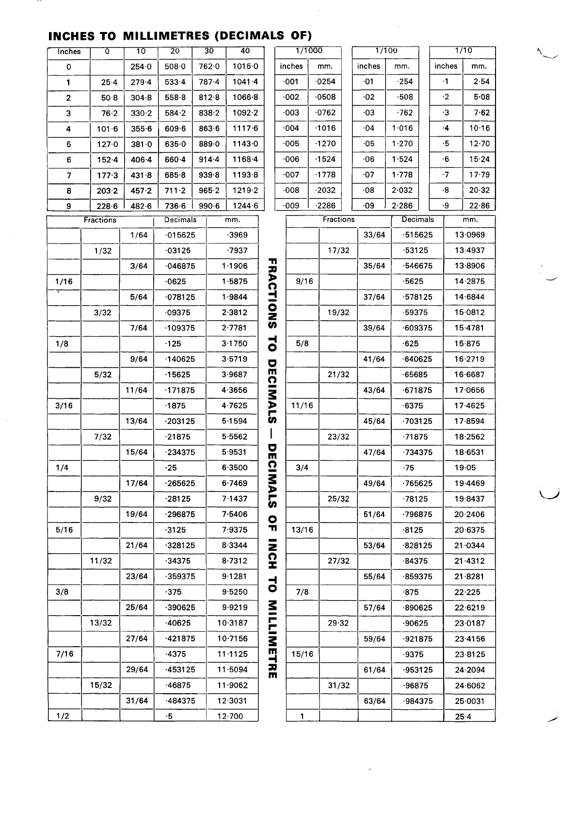 Norton Commando 850 - Inches to Millimeters (Decimals Of) Conversion Table; Fractions to Decimals - Decimals of Inch to Millimetre Conversion Table