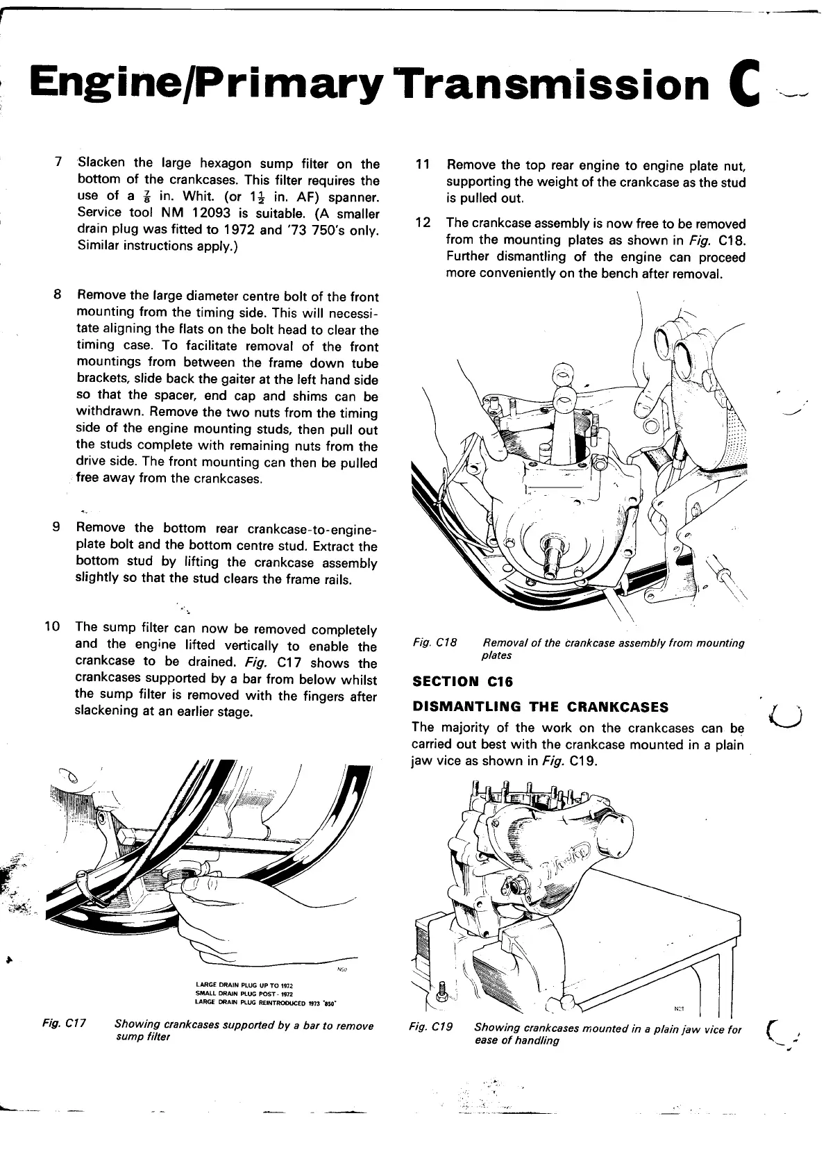 Norton Commando 850 - Dismantling the Crankcases; Removal of the Crankcase Assembly from Mounting Plates; Showing Crankcases Supported by a Bar to Remove Sump Filter; Showing Crankcases Mounted in a Plain Jaw Vice for Ease of Handling