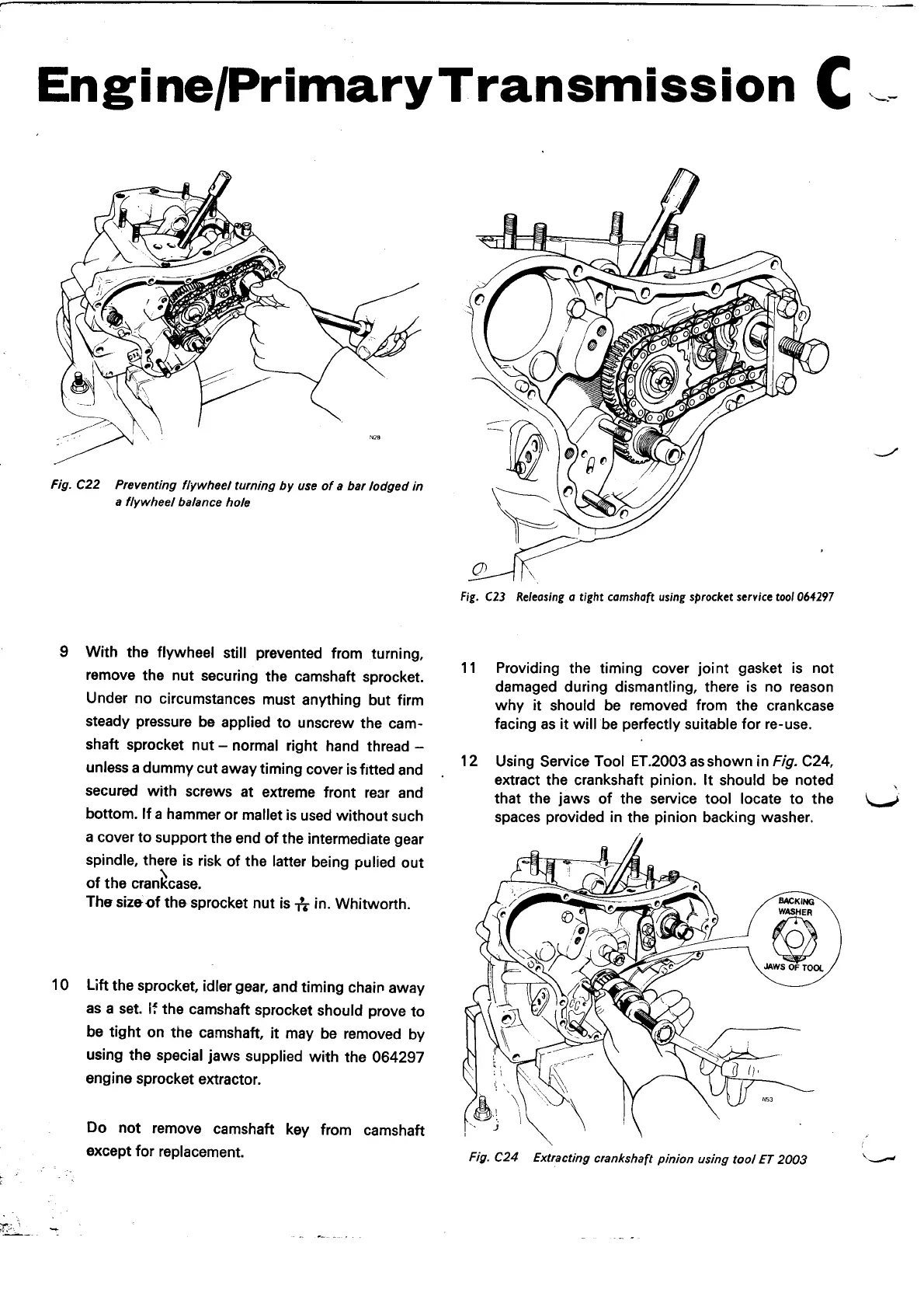 Norton Commando 850 - Preventing Flywheel Turning by Use of a Bar Lodged in a Flywheel Balance Hole; Extracting Crankshaft Pinion Tool ET 2003