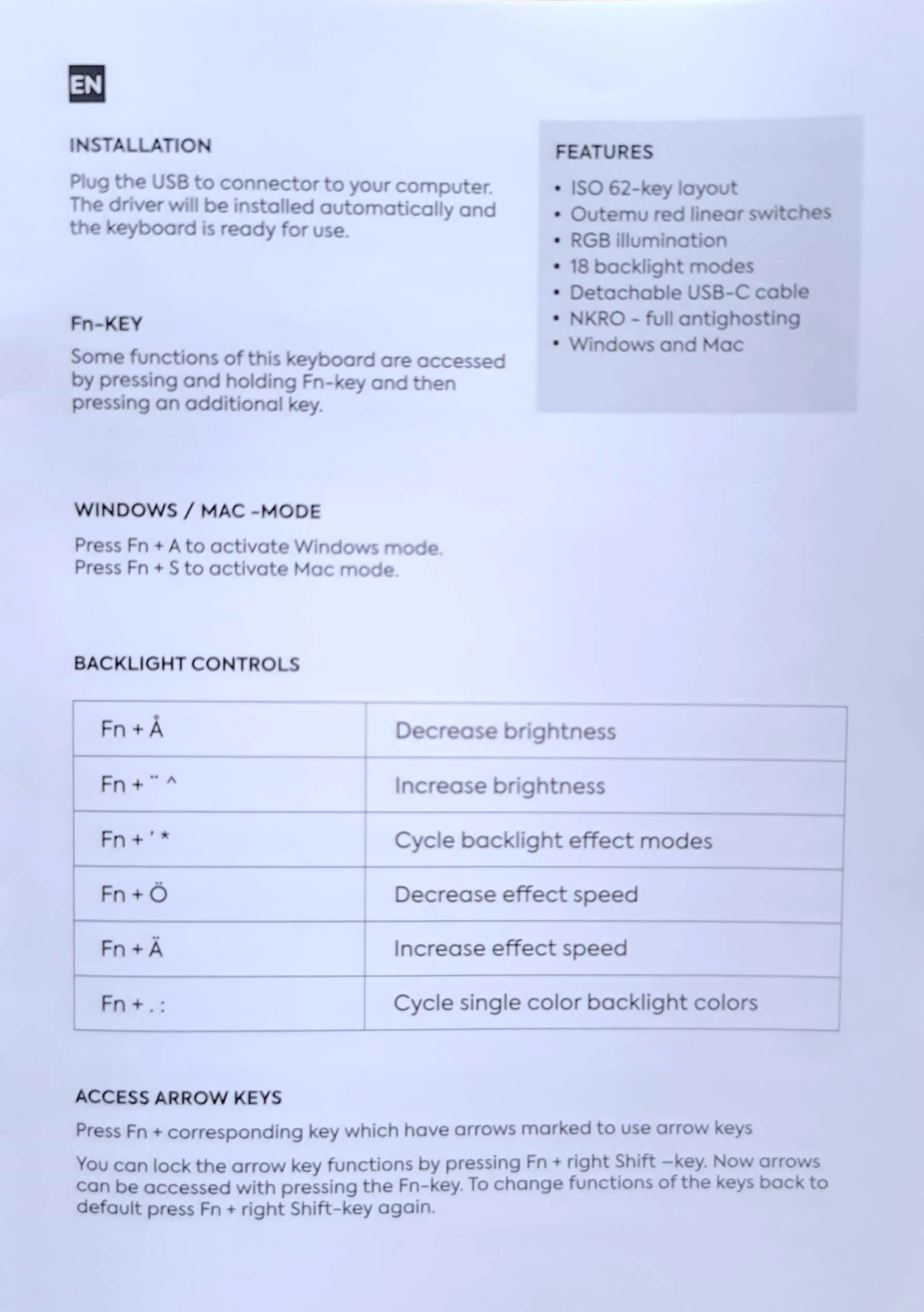 Nos C-450 - Installation and Features; Installation; Fn-Key Functionality; Operating System Modes