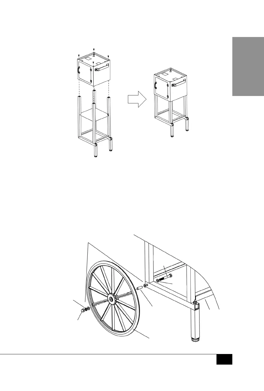 3. Attach the Wheel (E) to the #3 Bolt. Place #7 Flat Washer and #8 Locking Washer on