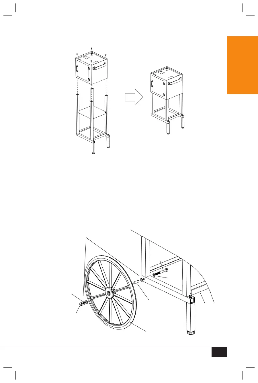 3. Attach the Wheel (E) to the #3 Bolt. Place #7 Flat Washer and #8 Locking Washer