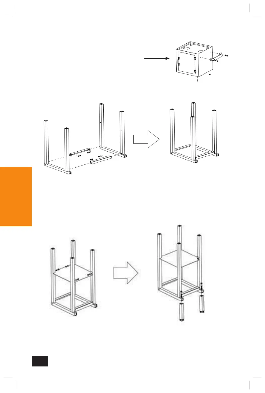 4. Fije las Patas (H) a los extremos sobresalientes del Soporte de base (F) usando dos