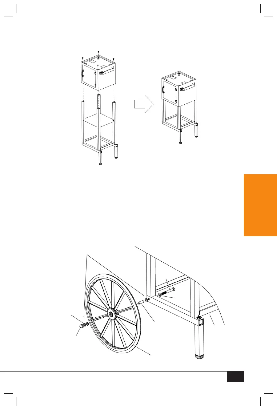 3. Coloque la Rueda (E) en el Perno No. 3. Coloque una Arandela plana No. 7