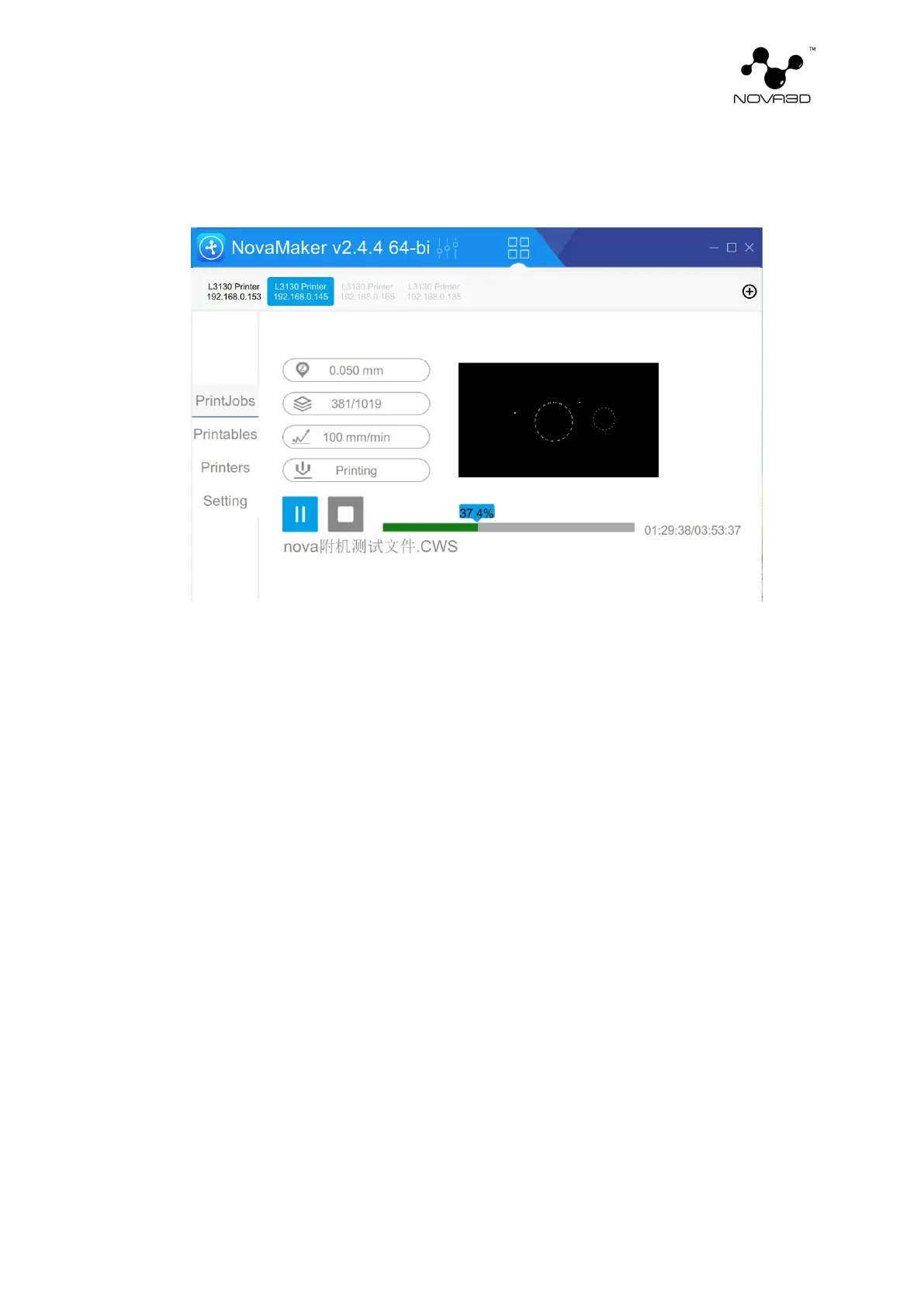 Each added printer can easily be managed in NovaMaker. You can start, stop and pause the