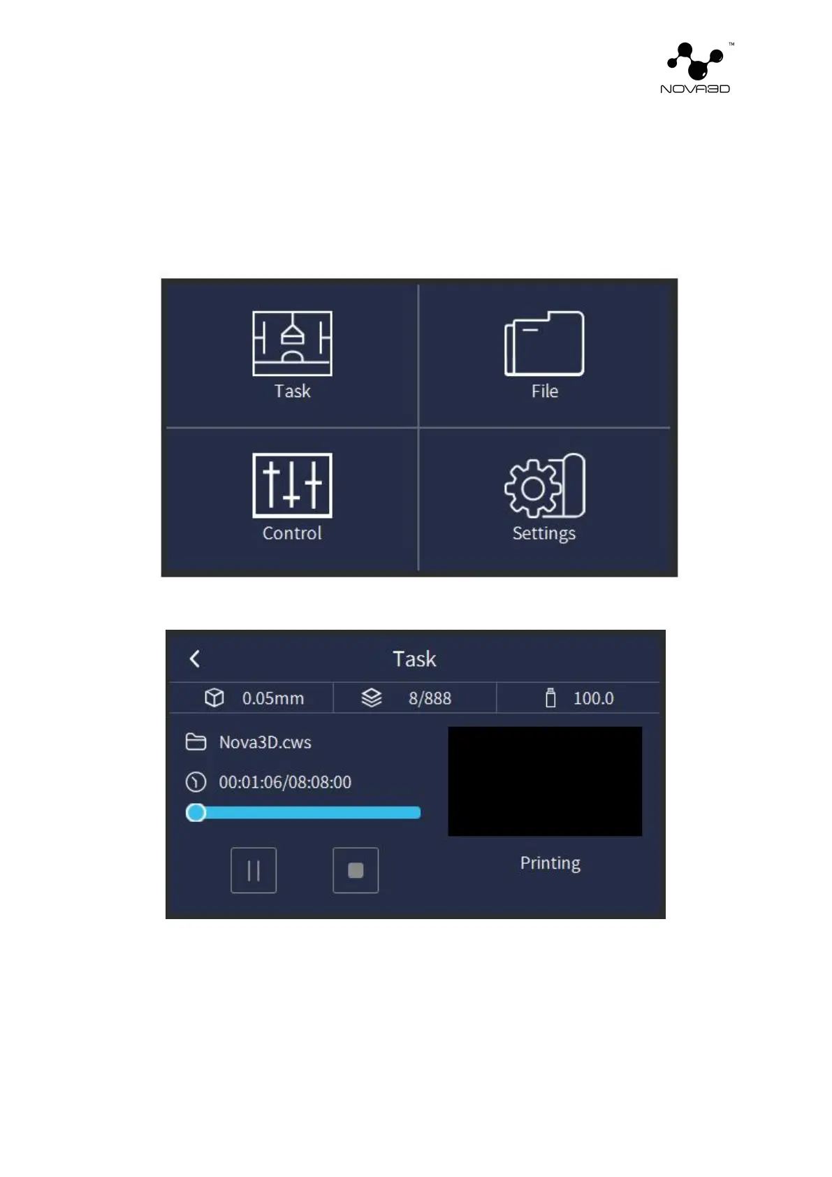 of slices, estimated amount of resin consumed for printing, file name, printing progress