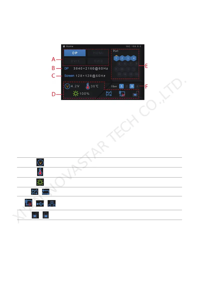 F: Connection status of optical fiber ports. Blue indicates that the connection is