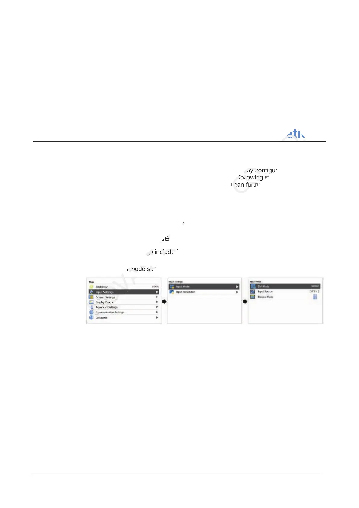 The input mode settings include DVI mode, input source and mosaic mode settings.