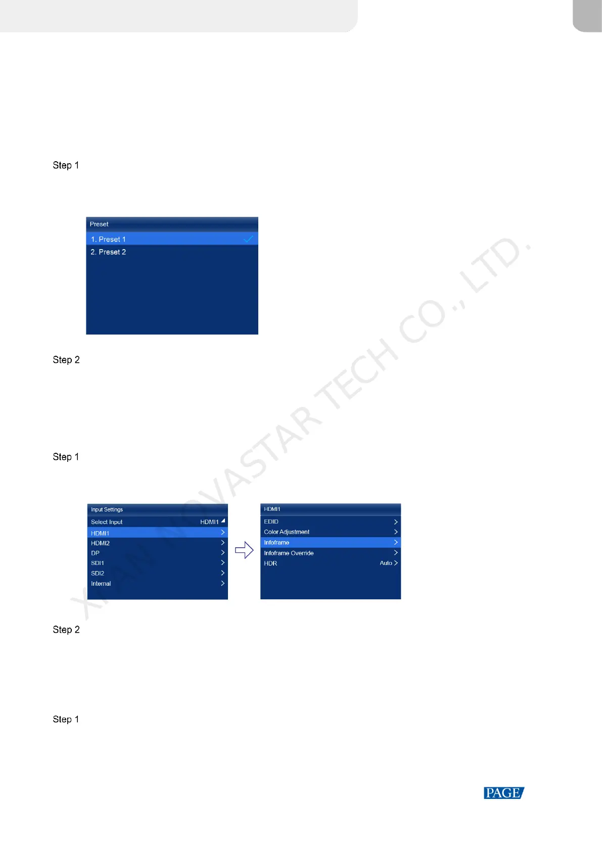 On the main menu screen, choose Input Settings > input source > Infoframe. The input source is HDMI1, HDMI2,