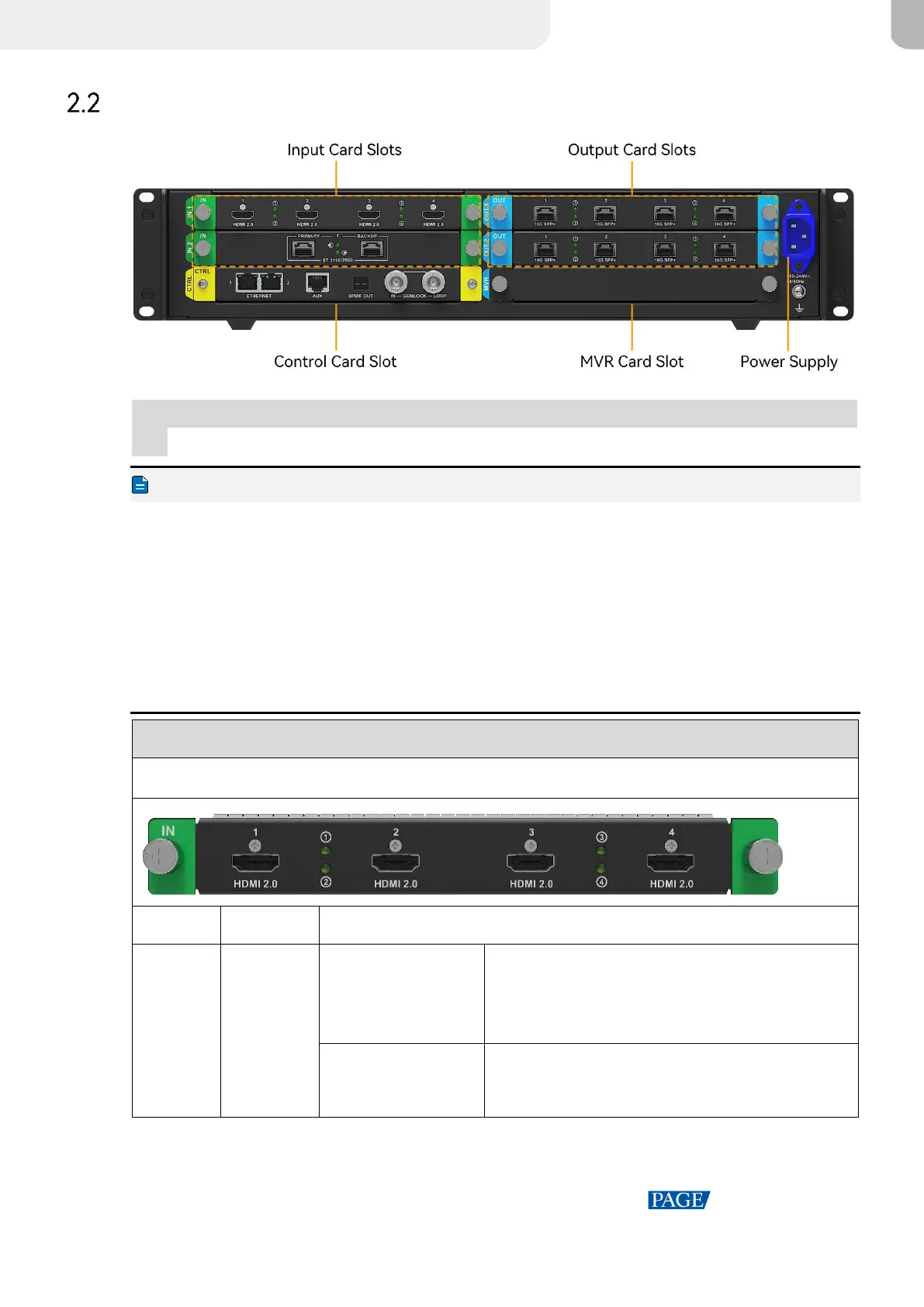 The card slot marked with "IN x" only supports the installation of input cards, where x is the slot number. For