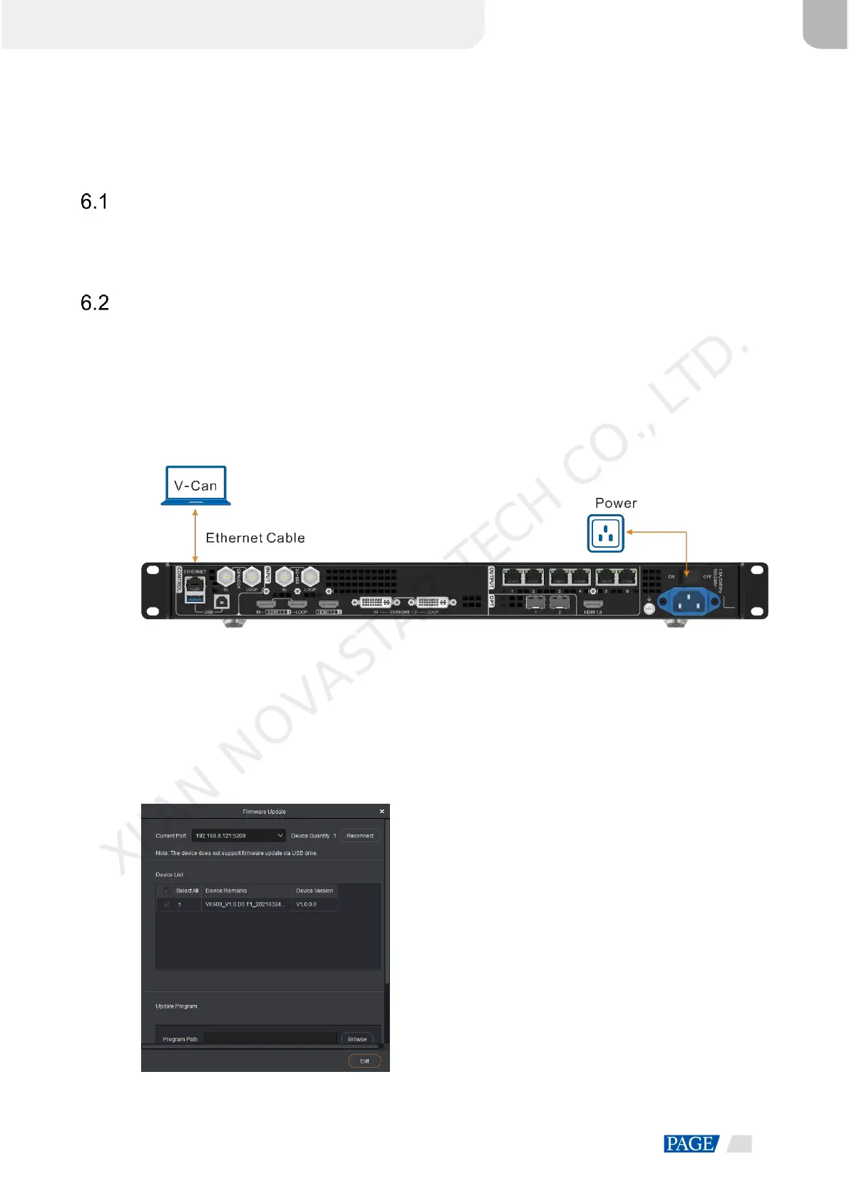 Before the update, use an Ethernet cable to connect the device to the control PC with V-Can installed, as