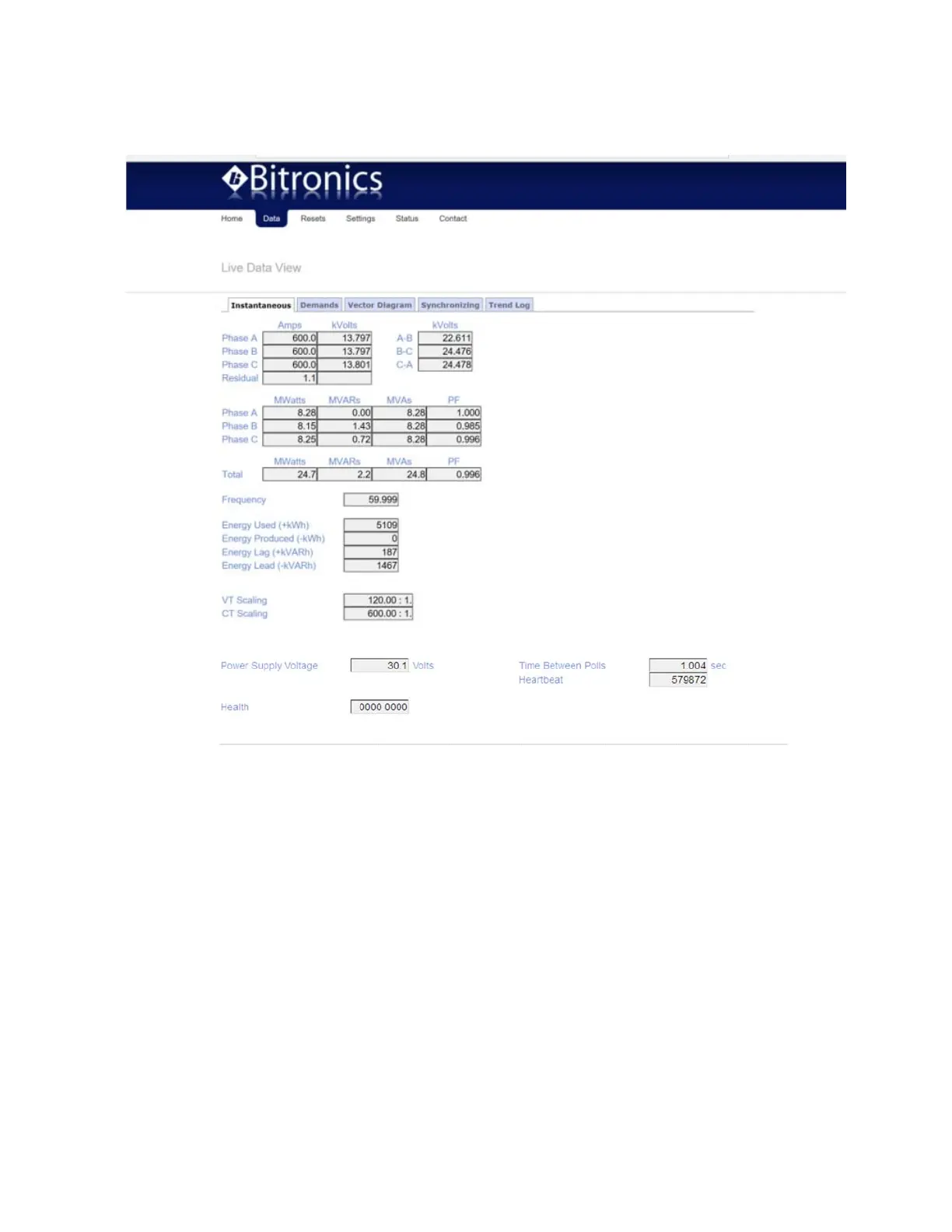 Data page: Five views – Instantaneous, Demands, Vector Diagram,