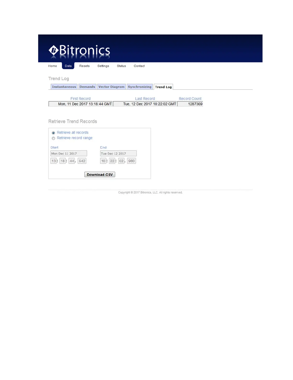 provides for retrieving it, or part of it via start and end times, in .csv format.