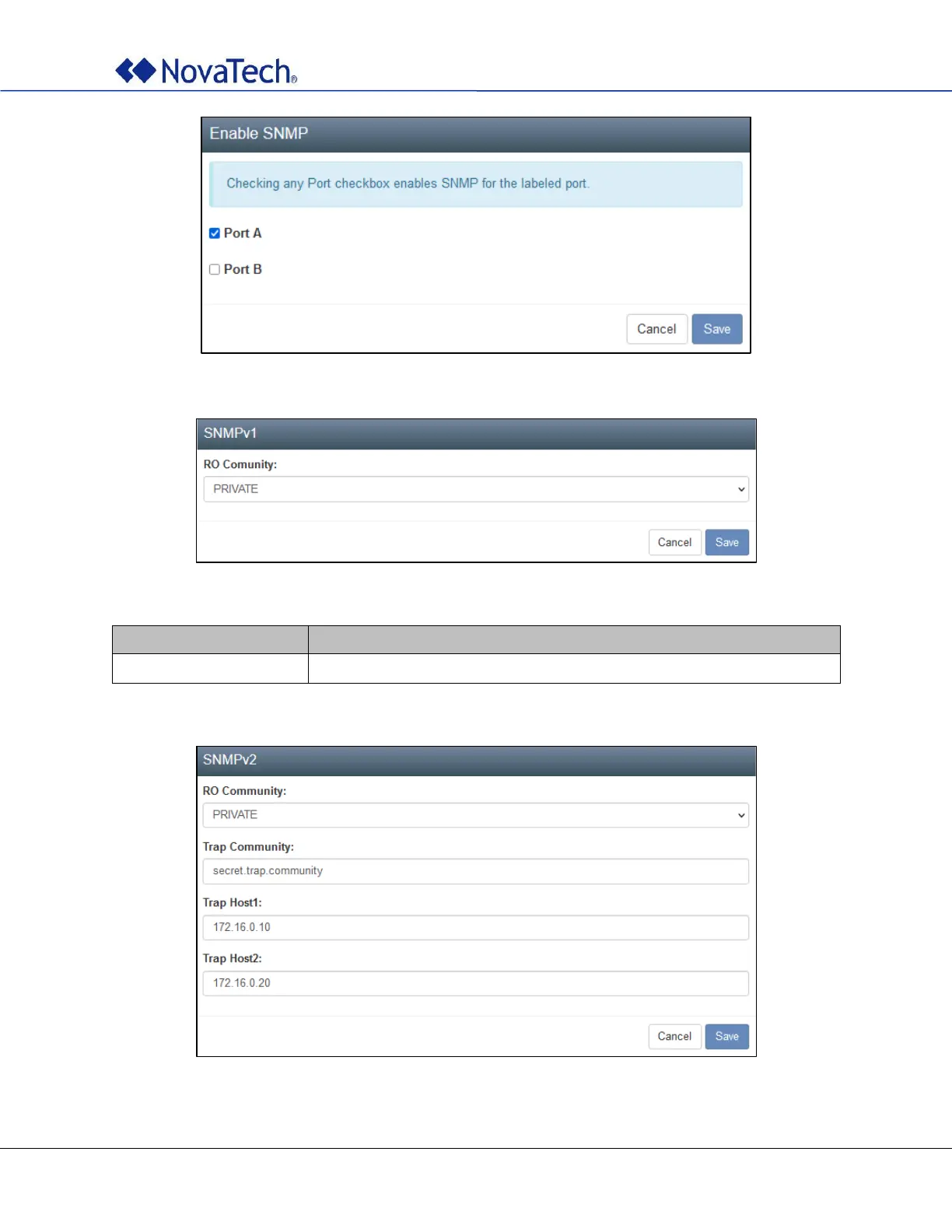 Novatech Kronos 2 Series - Figure 23: Enable SNMP; Figure 24: Snmpv1 Settings; Figure 25: Snmpv2 Settings; Table 12: Snmpv1 Settings