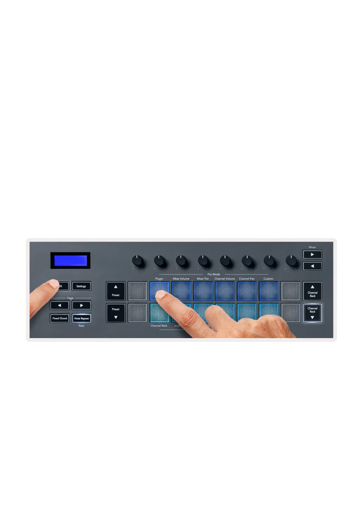 channels. While using Channel Rack Pad mode navigation banks in groups of eight so the pots line up