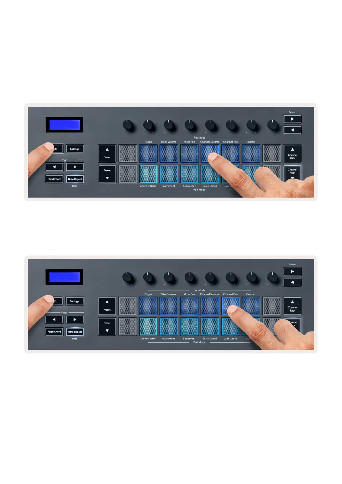 In Channel Volume mode, the FLkey’s eight pots map to the Channel Volume control in groups of