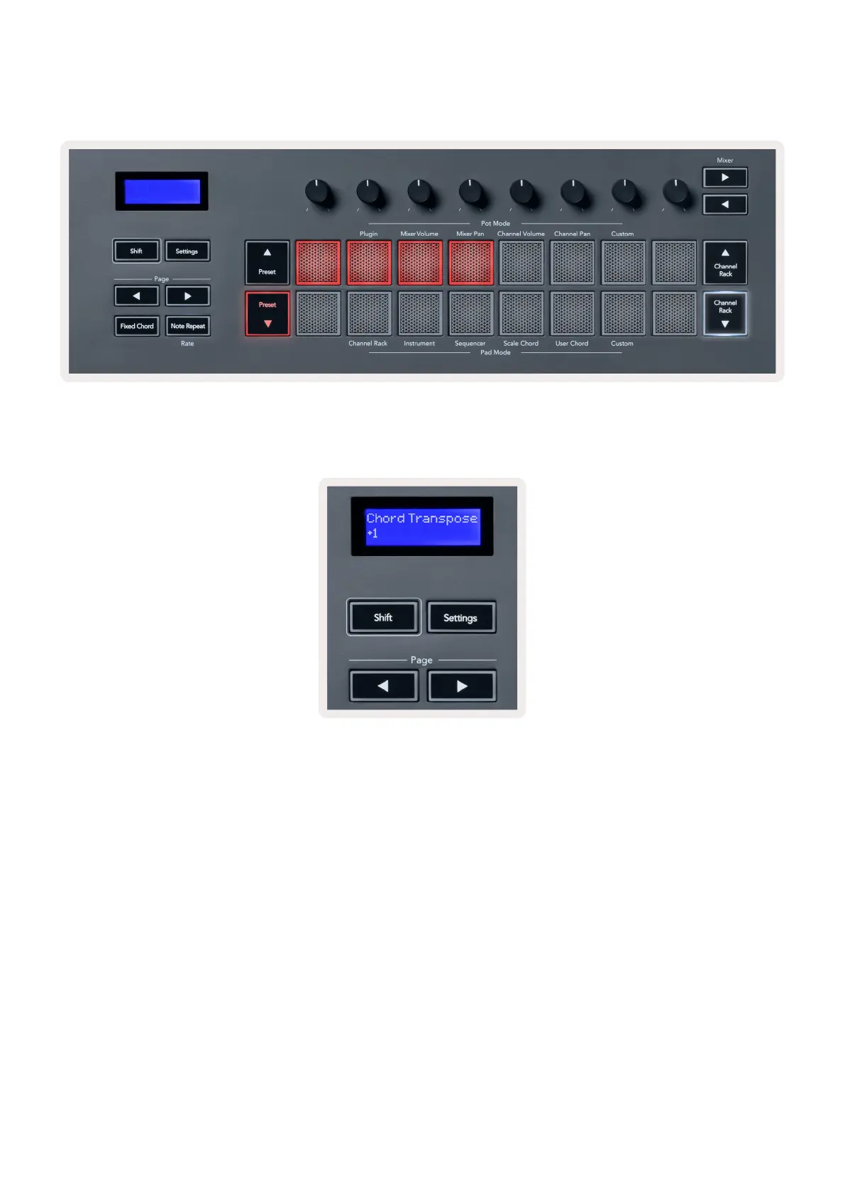 The Page ◄ ► buttons transpose the chord bank in semitones between -12 and +12, the FLkey’s