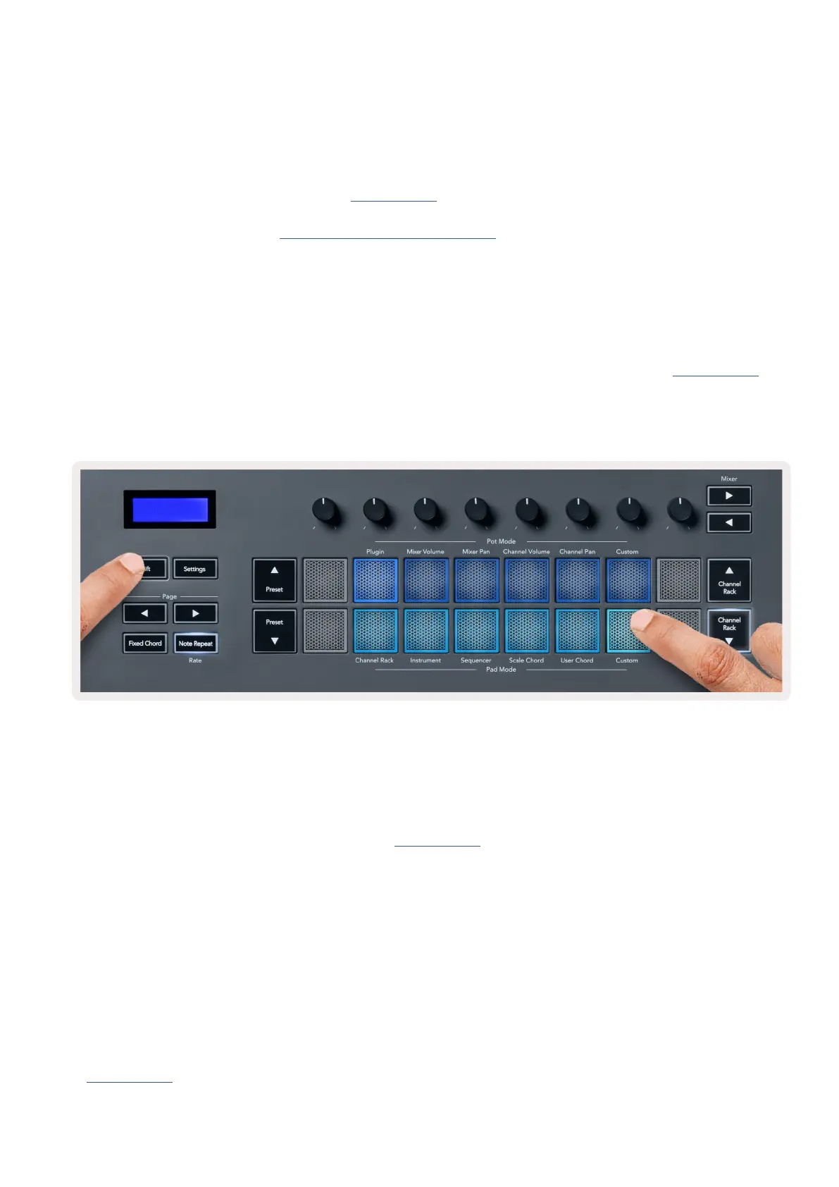 FLkey has one pad Custom Mode. To access this Custom Mode, hold Shift and press the Custom pad. You