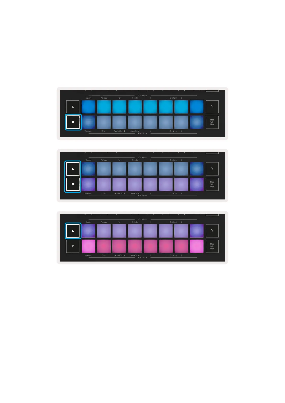 7ths and is lit a darker blue. Pressing the ▼ button will reveal a row of 9ths, with the pads lit up in
