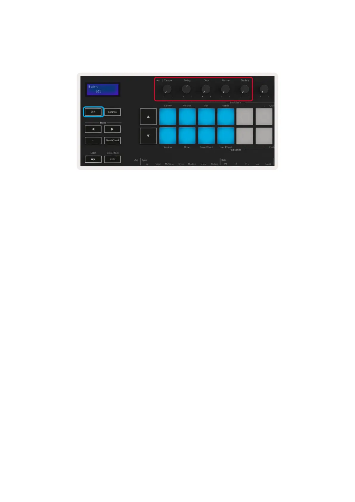 the Arpeggiator’s Swing, hold the Arp button, and turn the pot labelled Swing. By default (centre