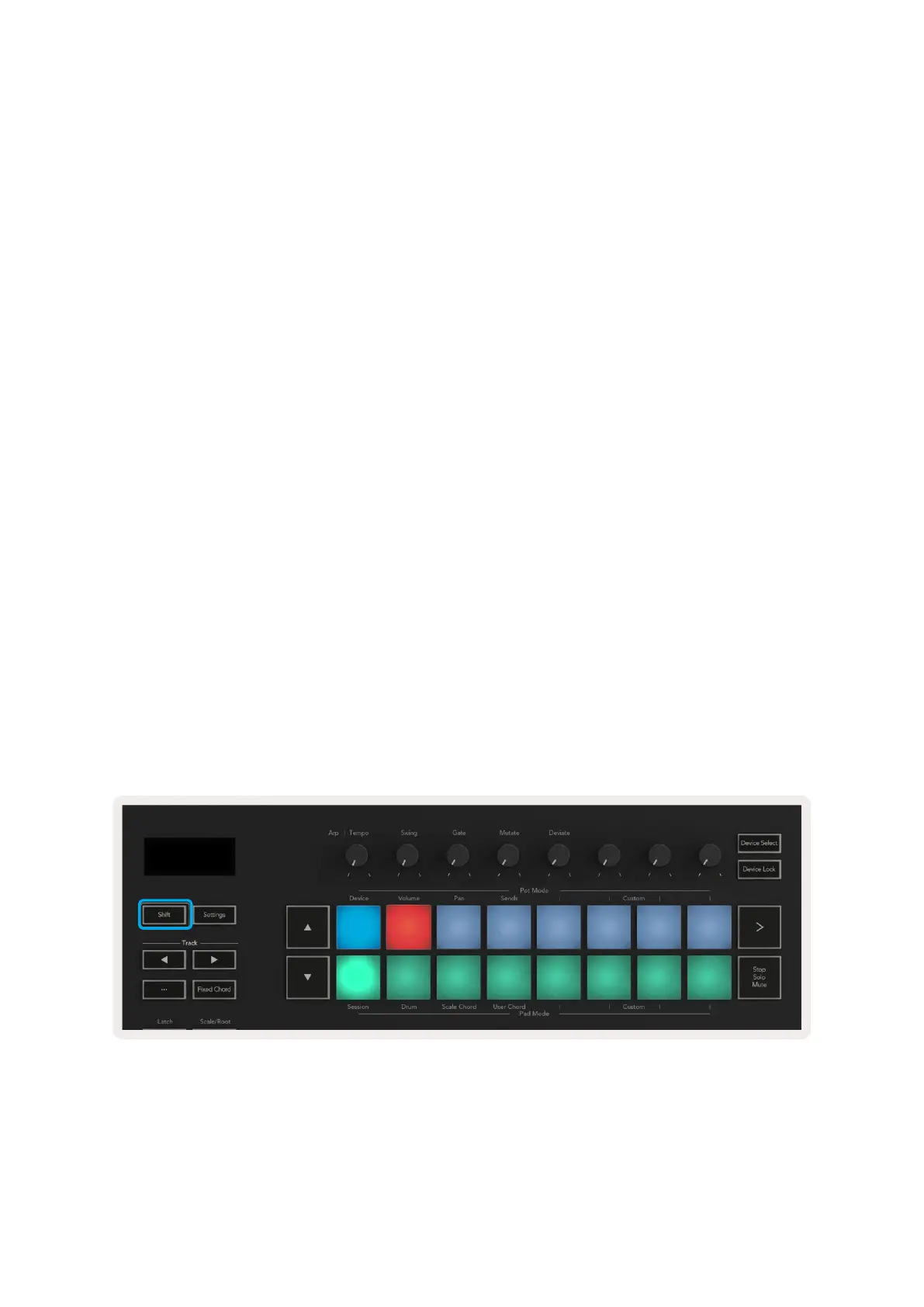 Press Shift on your Launchkey and your pad lights will look like the image below. The top row of pads
