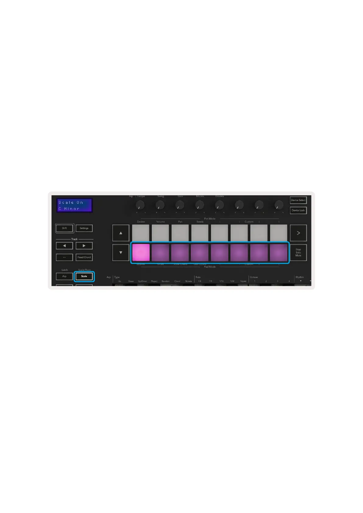 The bottom row of pads light so you can select a scale, the screen shows the selected scale. From left