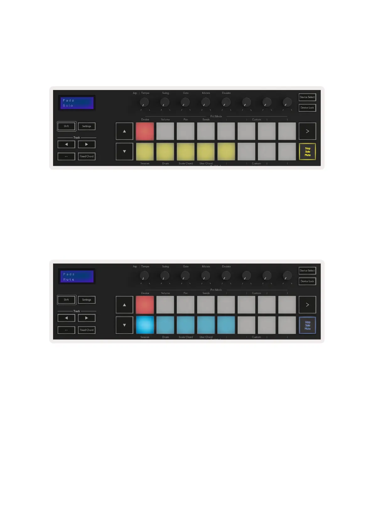 bottom row of pads will be lit blue and toggles the track solo. When soloed the pad will become a