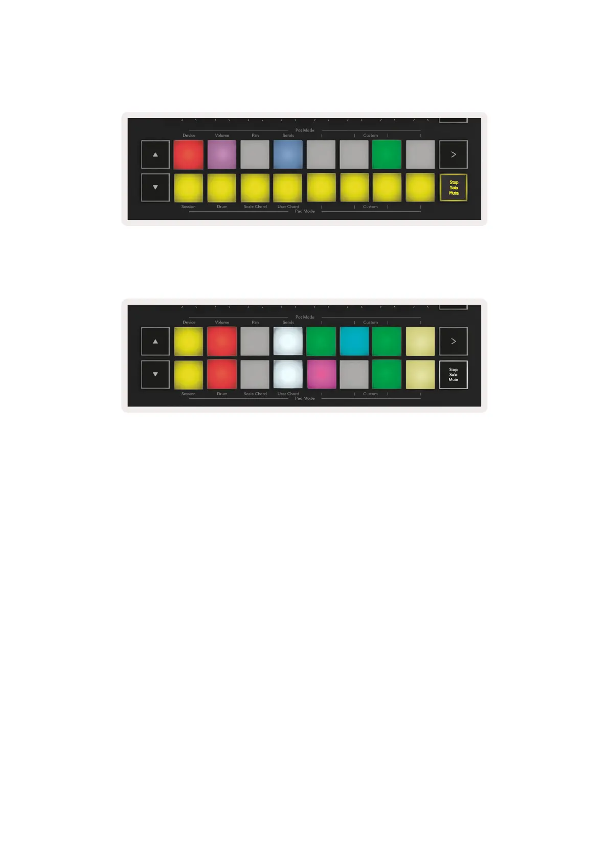 Mute (Yellow) – Pressing pads will Mute the corresponding tracks. The pads will dimly glow for muted