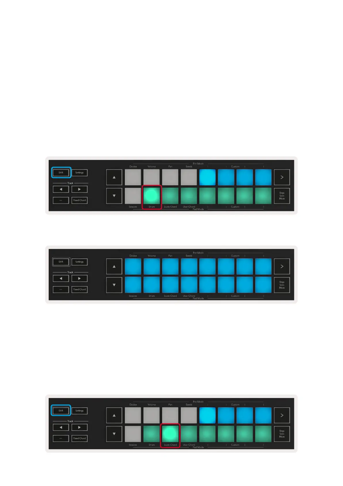 the Scale Chord pad while holding the Shift button. Each row of pads will now contain a bank of