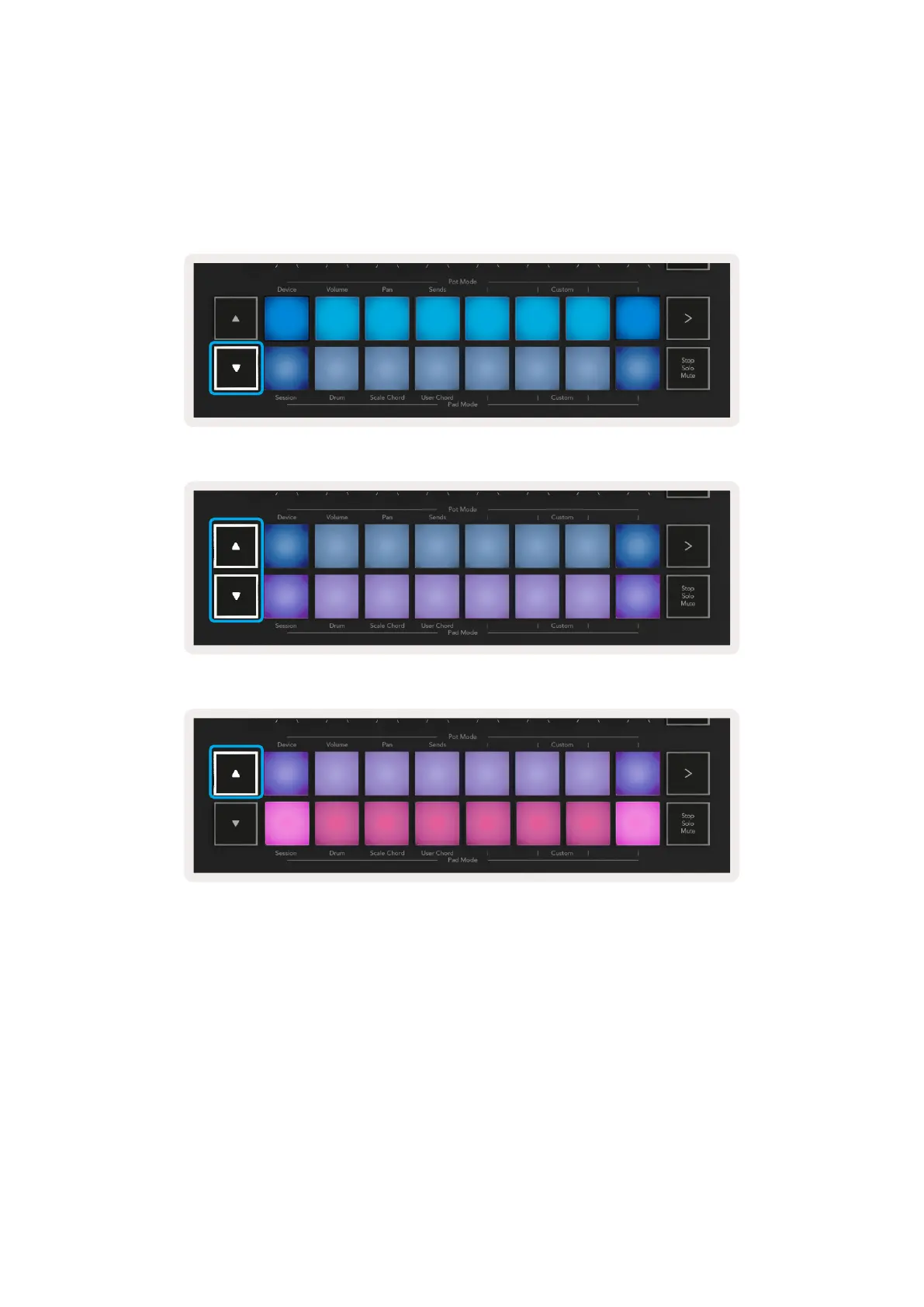darker blue. Pressing the ▼ button will reveal a row of 9ths, with the pads lit up in purple, below this