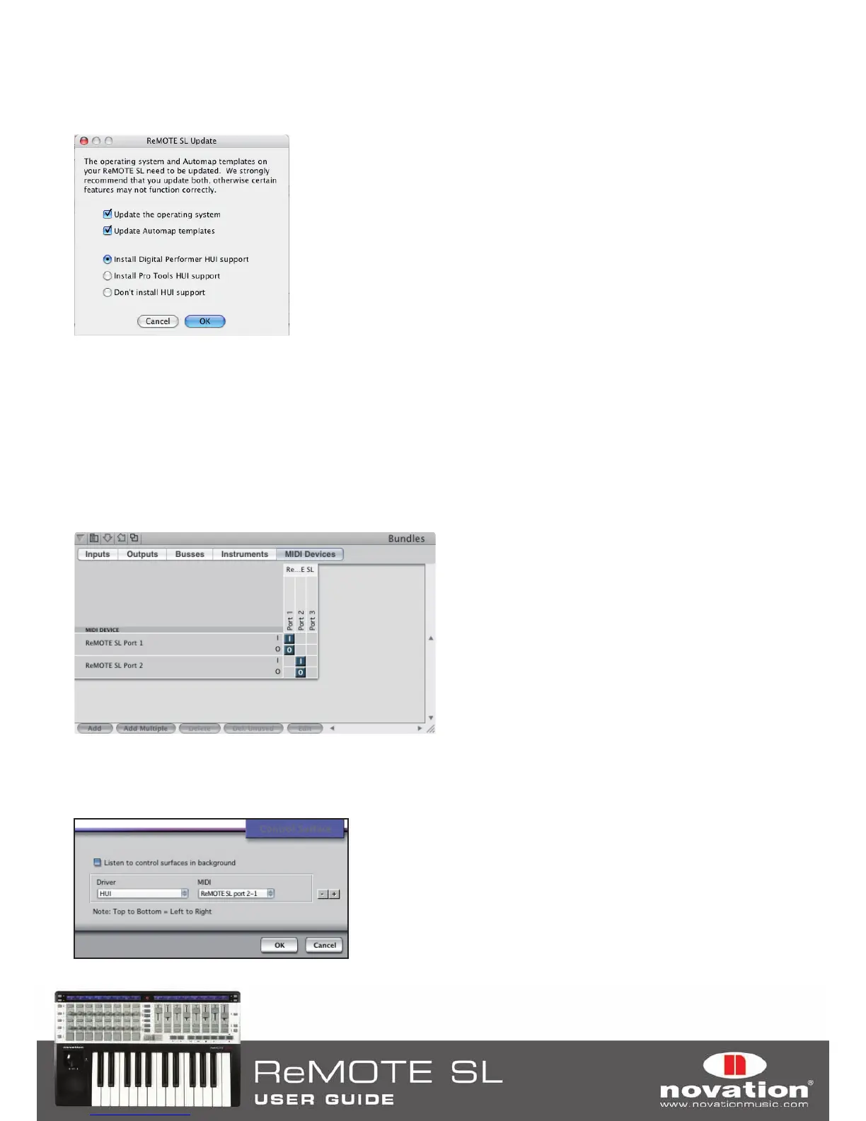 using the ‘+’ button then select ‘HUI’ from the ‘Driver’ drop-down menu and ‘ReMOTE SL Port 2-1’ from the ‘MIDI’ drop-down