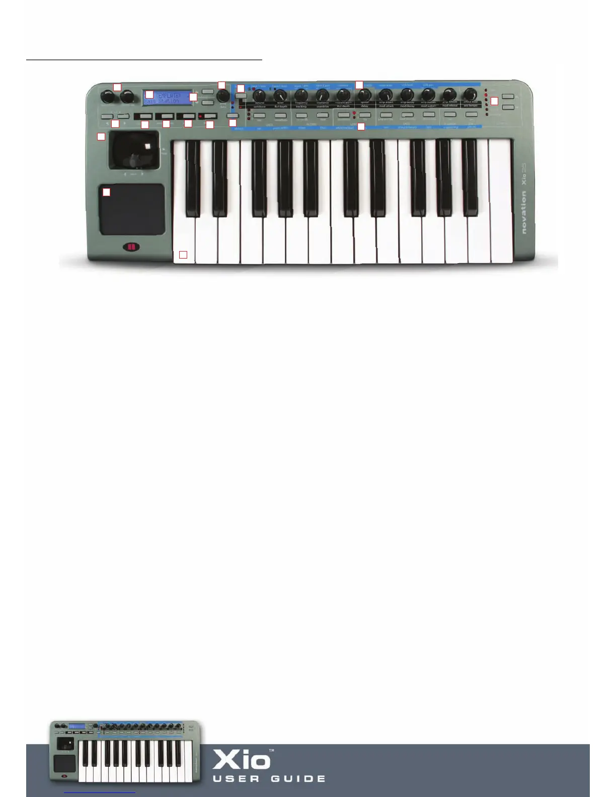 17. Pitch/mod Joystick – Controls pitch-bend and modulation in Synth mode. Also fully assignable joystick