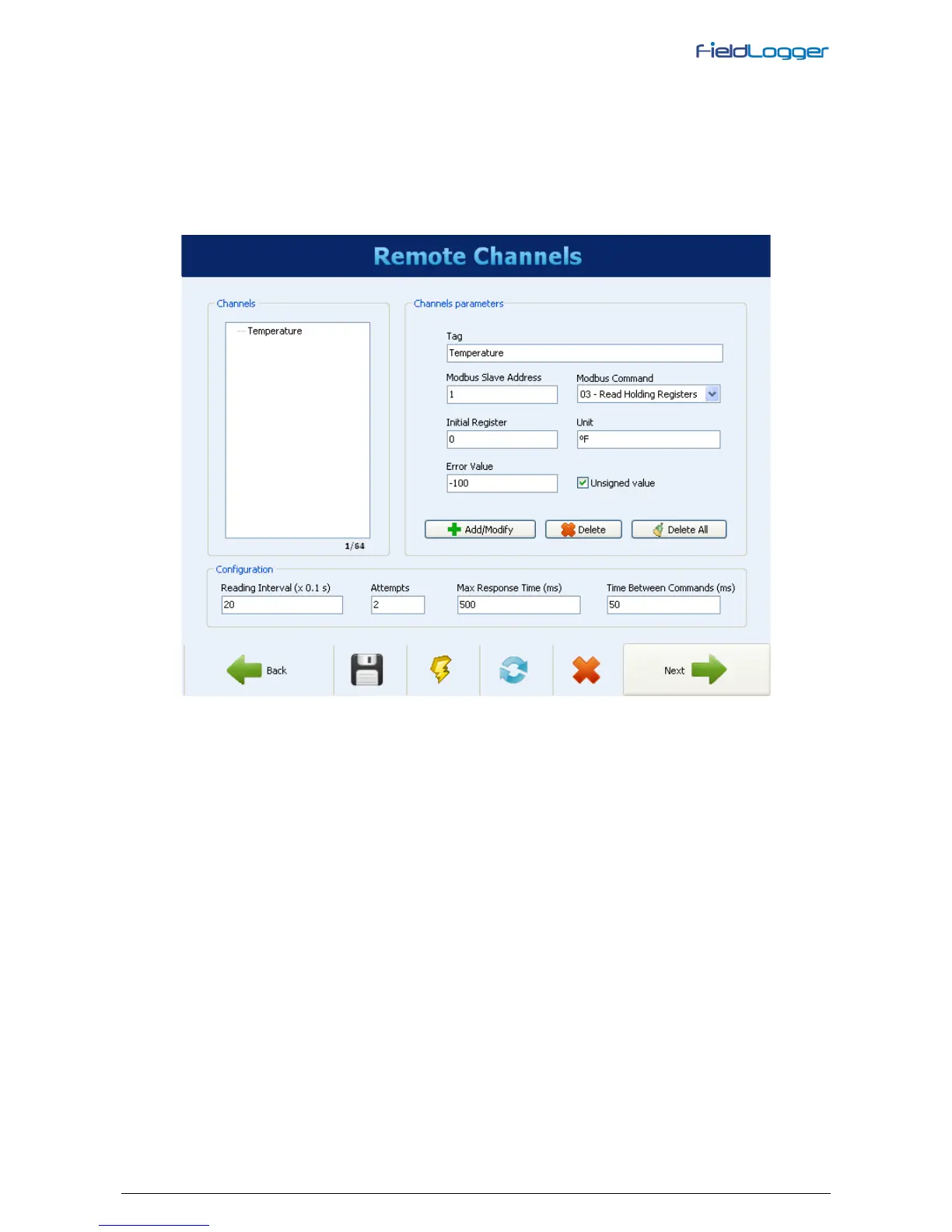1000 to 5000 ms) indicates how much time FieldLogger will wait between receiving the slave’s response and sending