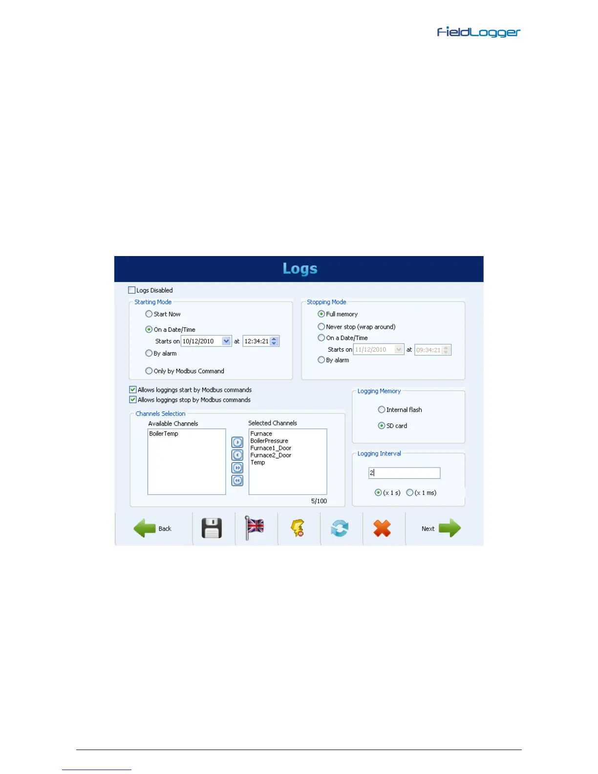 If you want to use the start and/or stop of the loggings through Modbus commands, you must enable these options. In