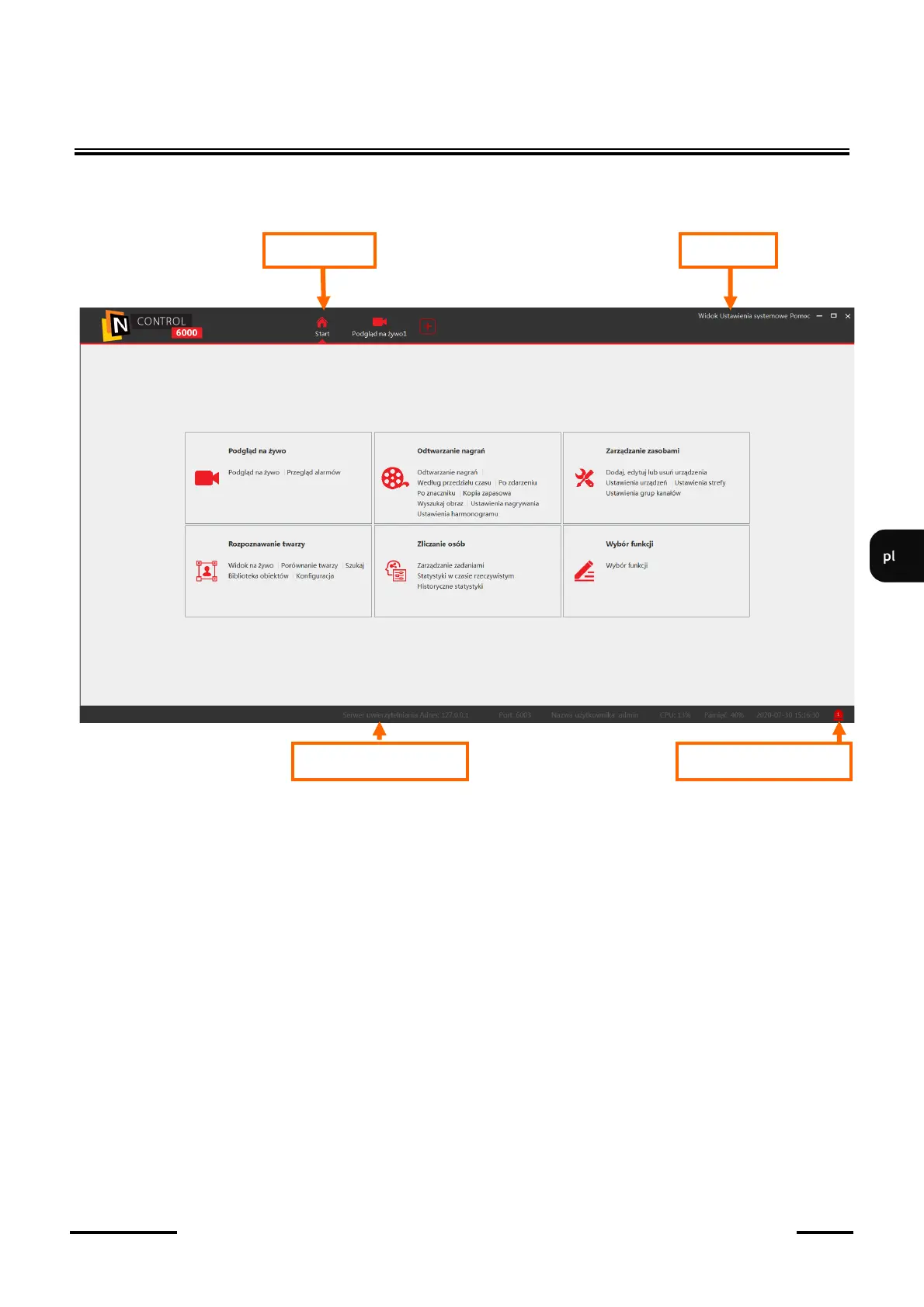 zalogowanego użytkownika, poziom obciążenia jednostki (CPU i pamięć), aktualną datę i czas.