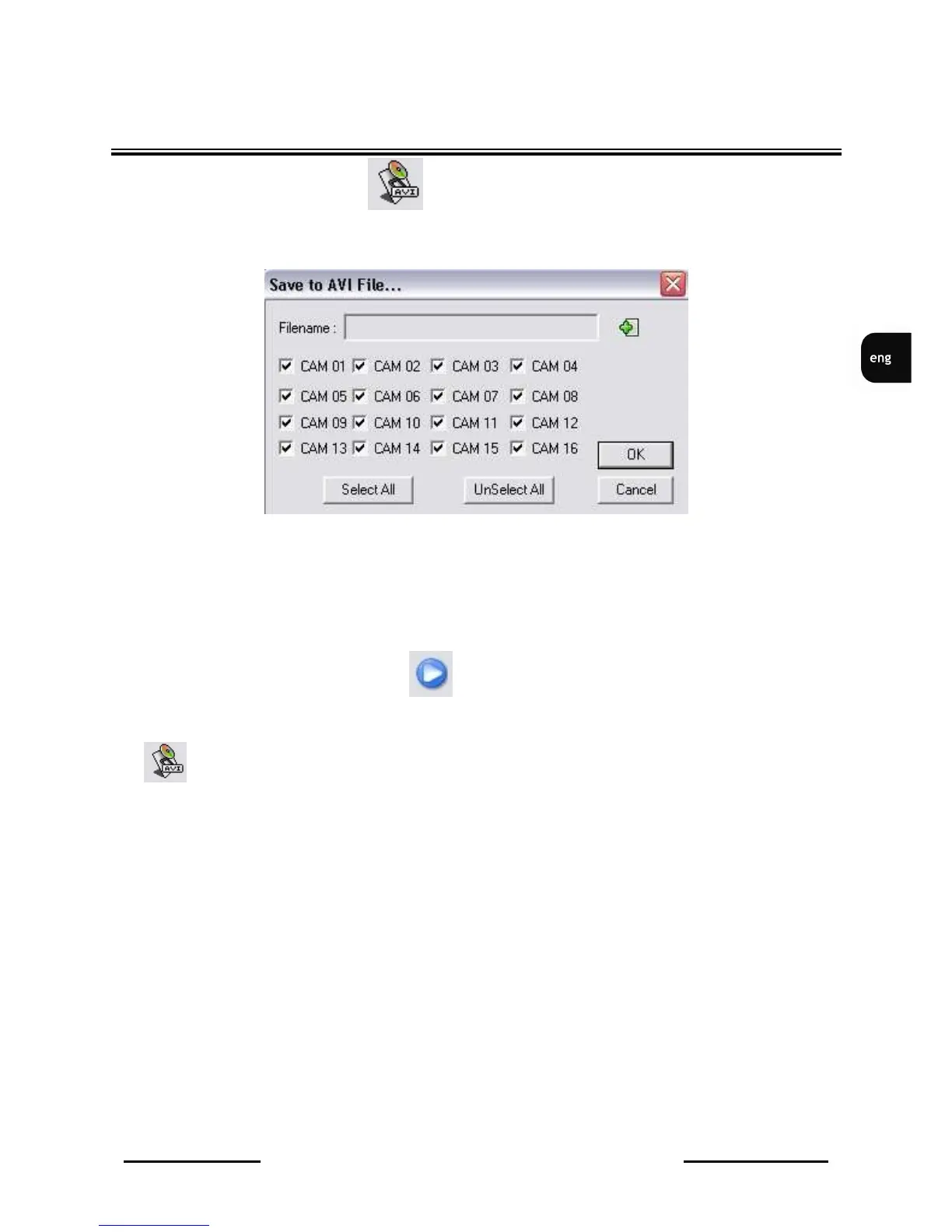 Filename position is used to select AVI file save path (when green „plus” icon is clicked). CAM 01 to