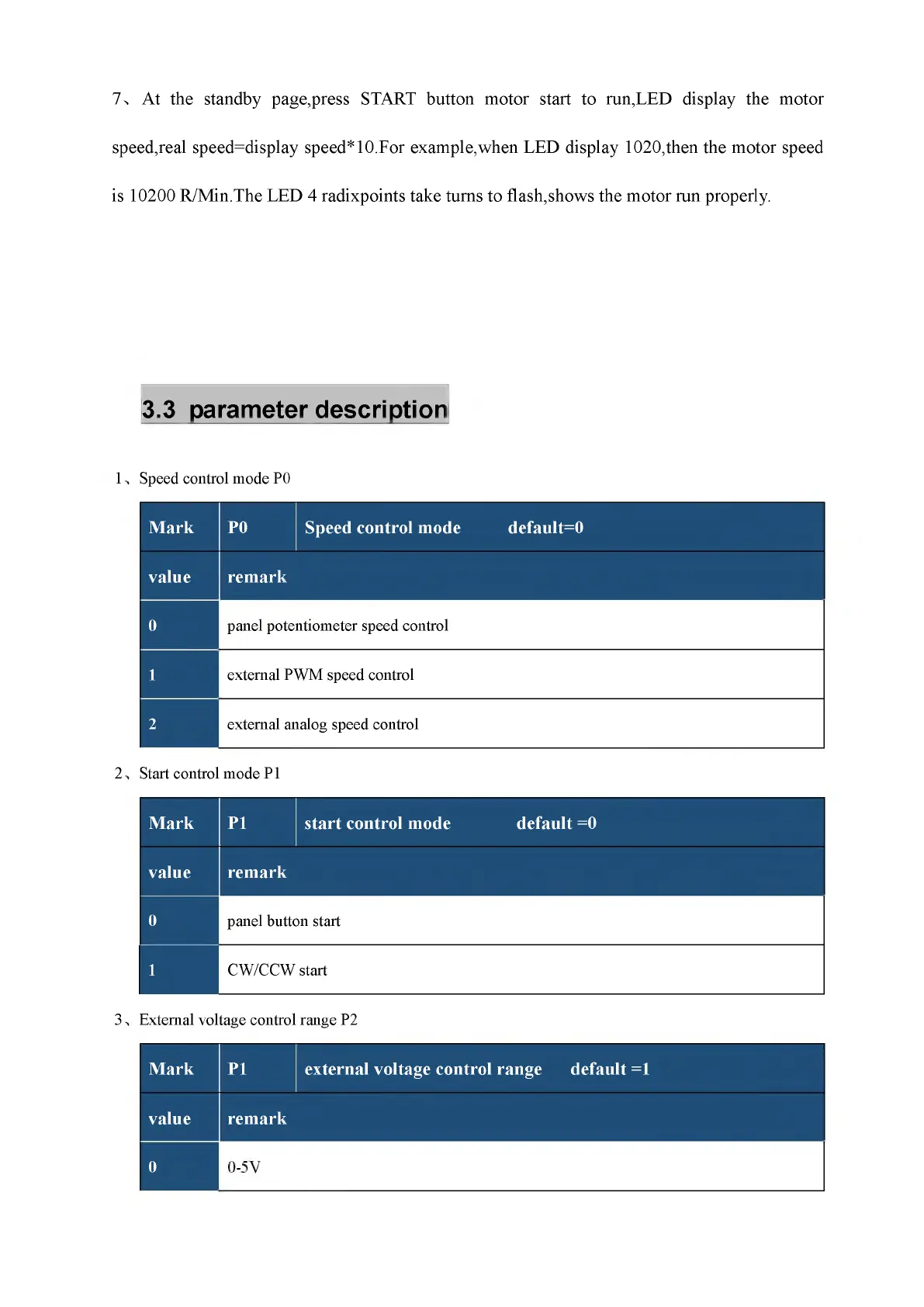 speed,real speed=display speed*10.For example,when LED display 1020,then the motor speed