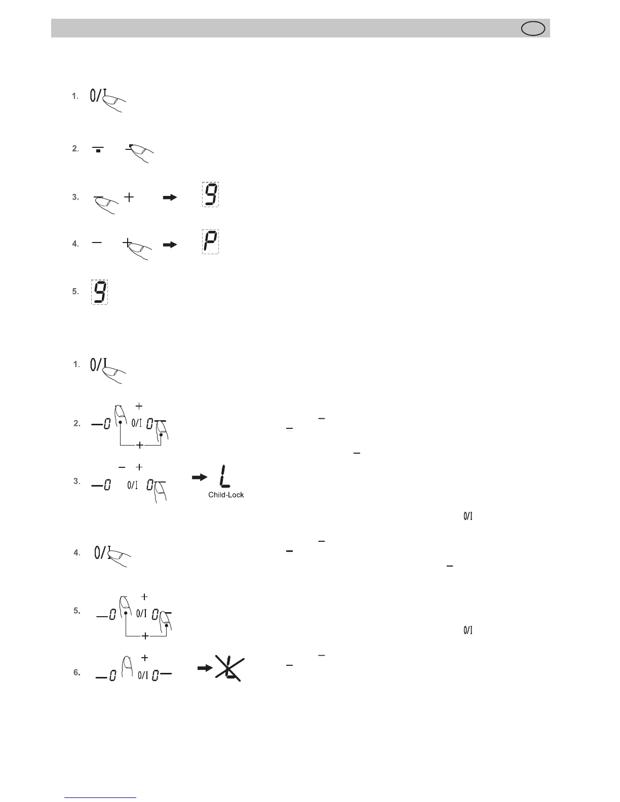 signo de Child-Lock; el manejo está bloqueado y la encimera