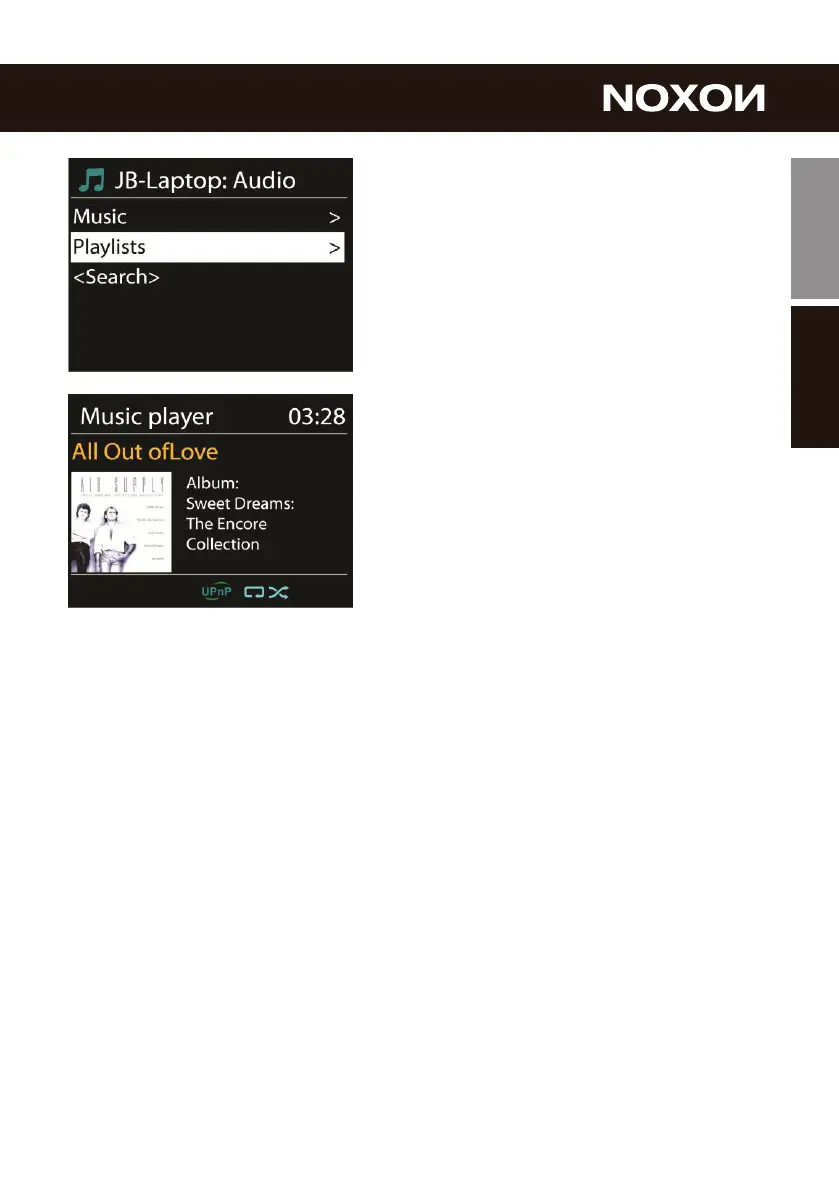 with gures for elapsed and total track time. At the bottom of the screen, an icon indicates UPnP