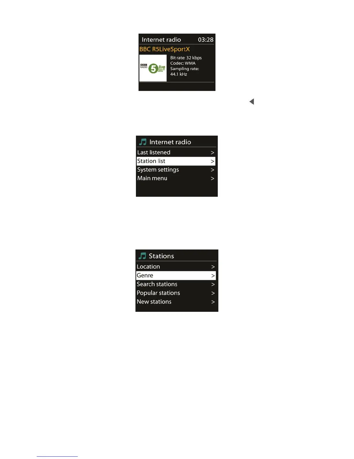 When Internet radio mode restarts, the last-listened station is selected. To select