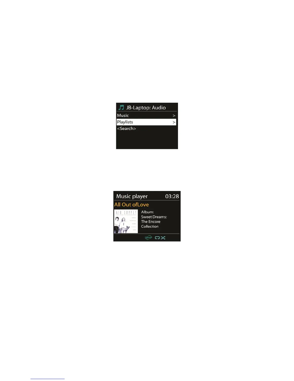 While a track is playing, the screen shows its track and artist (UPnP). There is also a