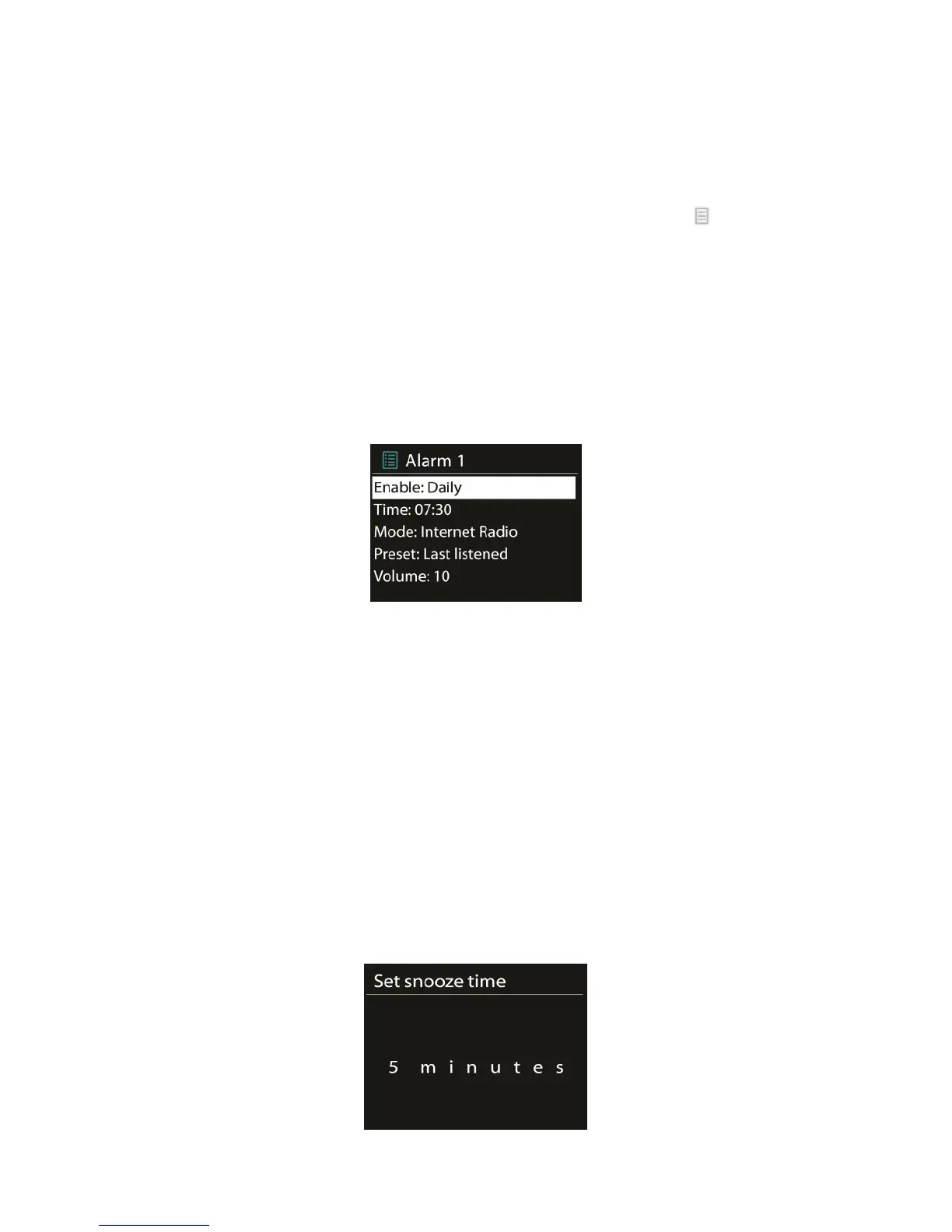 control. You can change the snooze period. The radio returns to standby for the set period,