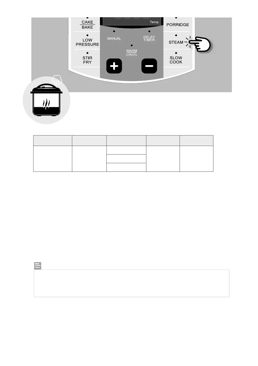 5. 反复按 [STEAM] 按钮选择所需的预设烹饪时间,或按 [ + ] 或 [ – ] 按钮根据食谱调整